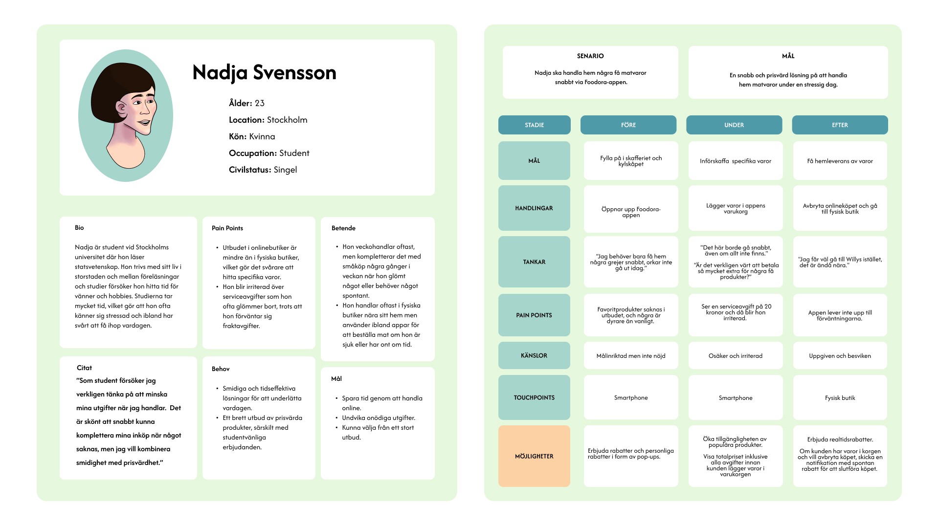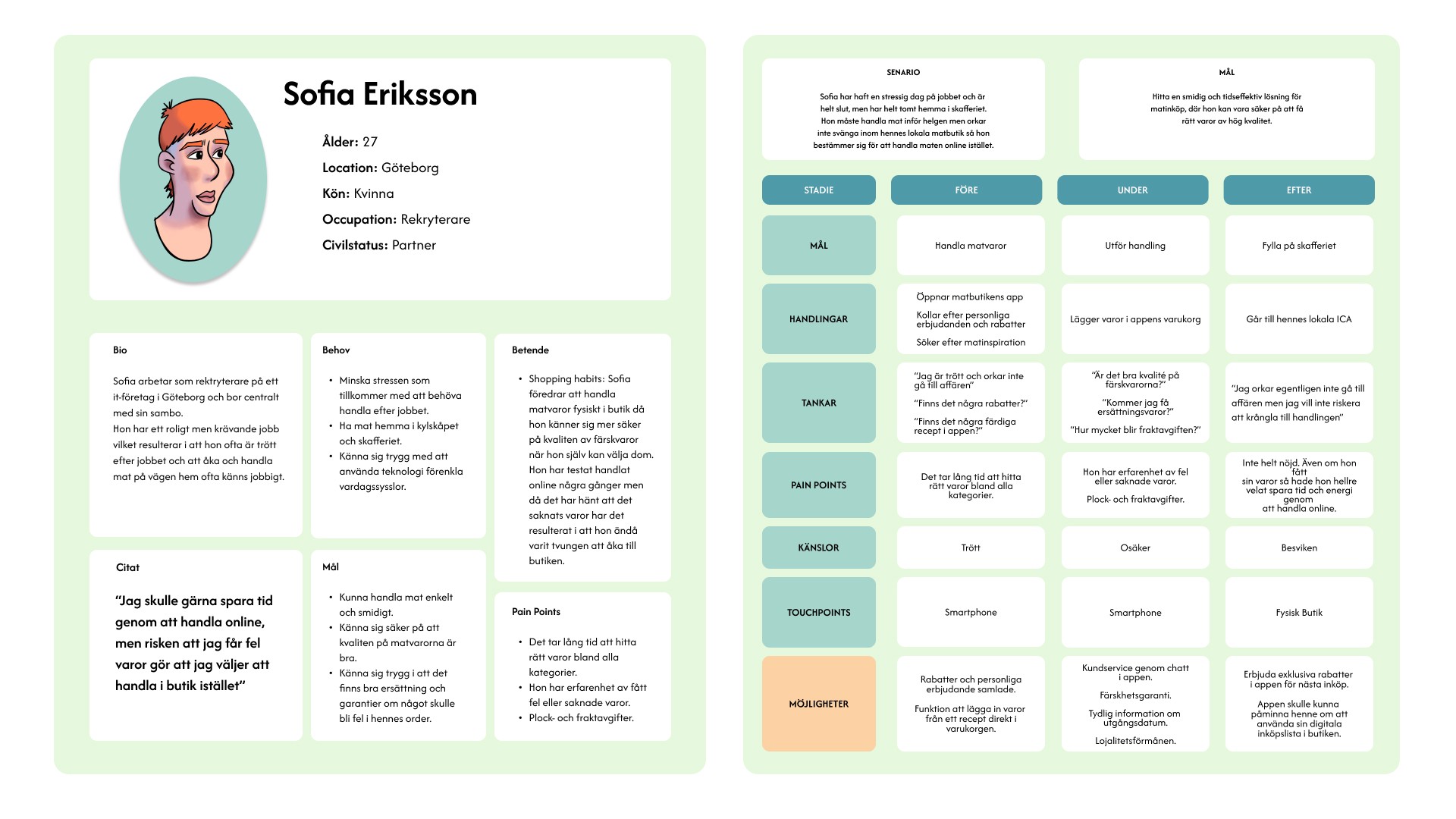 Personas and user journey based on results from screening, survey and interviews.
